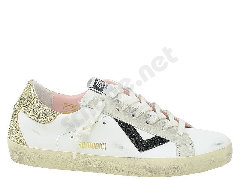 4B12 Suprime D320 Weiss Gold Schwarz - Sneakers - Turnschuhe 4B12 Suprime D320 elegantes Damenmodell aus Glitzerstoff und Leder, hergestellt in Italien. Damenmodell mit Leder, Schnürsenkeln und Gummisohle im Used-Look.